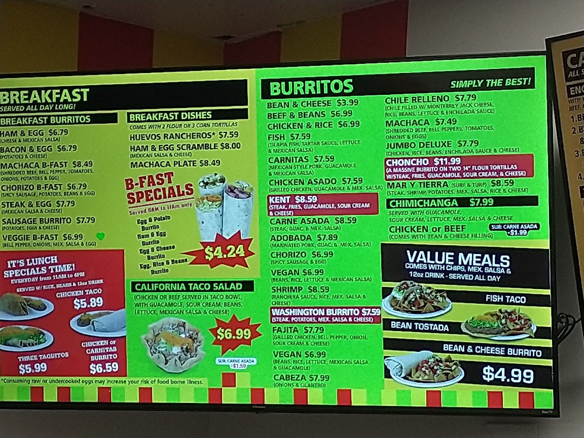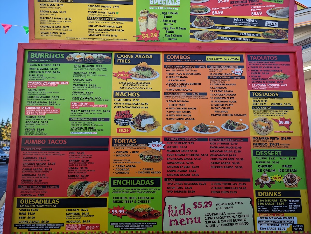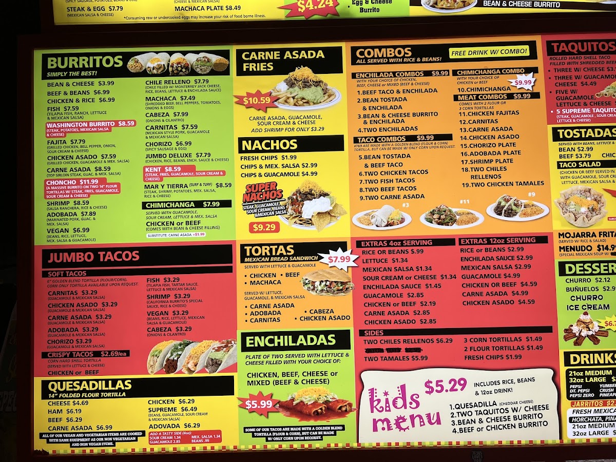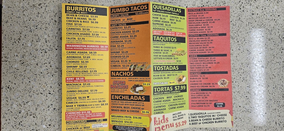 Highlights such as the Carne Asada Fries, Beef Taco & Enchilada Combo, and unique burritos like the Choncho or Washington Burrito showcase a balance of classic and creative flavors. These dishes complement the friendly and informal atmosphere, inviting guests to enjoy their meal in a space that feels like a neighborhood spot. Whether visiting with family or stopping by for a solo treat, the menu’s variety accommodates different appetites and times of day.